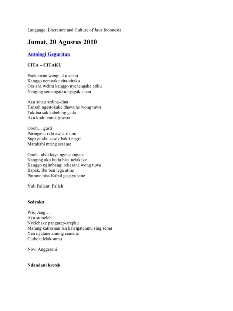 Play this game to review other. Megatruh senjawan budiyanto ibu saka lemah pangulandaran kene Dari geguritan dan lirik lagu campursari menurutnya hampir sama. Geguritan bekti marang ibu, kagem ibu, amanat lengkap. 4.3.2 pamilihing tembung sajrone geguritan layang kagem ibu.